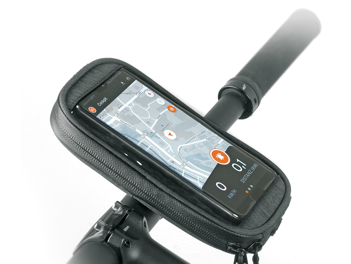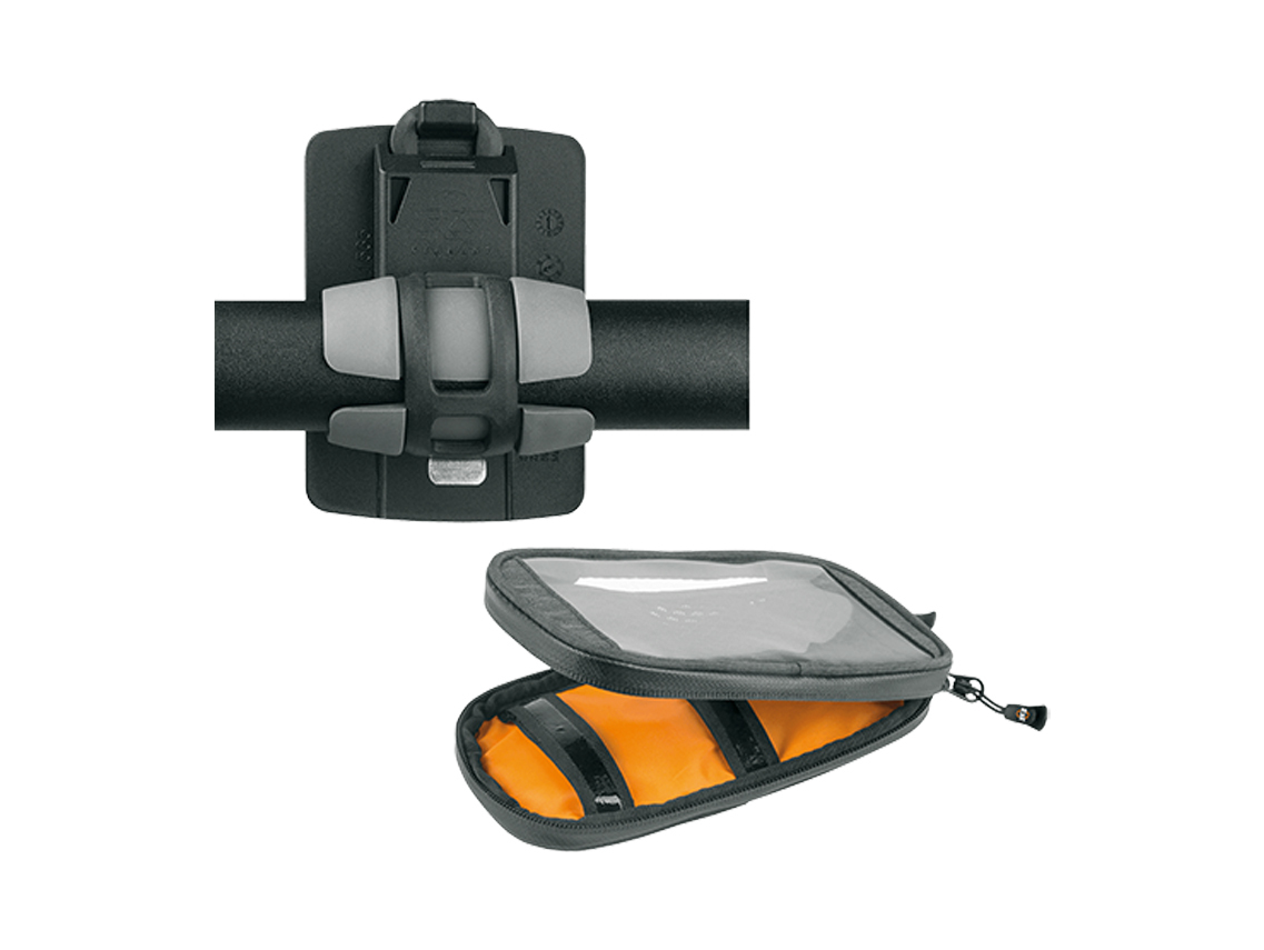 The smartphone pouch is mounted on the holder using a strong hook and loop fastener. The telephone can be used through the transparent film. Larger smartphones can be stowed away in the smartphone pouch so that they are perfectly protected from splashwater and rain.