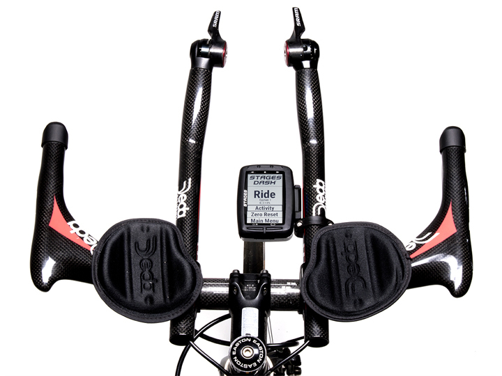 The machined aluminum Stages Dash Aerobar Mount is made to mount Stages Dash on the aero extensions of triathlon or time-trial bikes allowing for optimal screen and button placement when in the aerodynamic position.